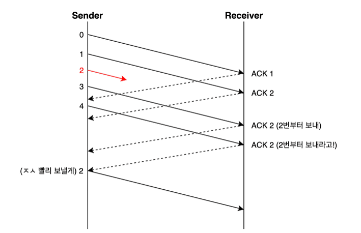 해당 기법을 빠른 재전송 이라고 부르며, 송신 측은 자신이 설정한 타임 아웃 시간이 지나지 않았어도 바로 해당 패킷을 재전송할 수 있기 때문에 보다 빠른 전송률을 유지할 수 있게 된다.