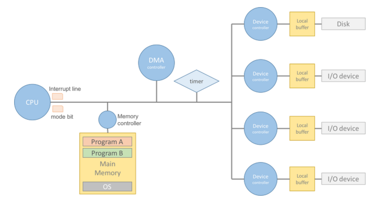 컴퓨터 시스템의 구조는 컴퓨터 내부 장치인 CPU, 메모리와 컴퓨터 외부 장치(입출력 장치)인 디스크, 키보드, 마우스, 모니터, 네트워크 장치 등으로 구분된다. 컴퓨터는 외부 장치에서 내부 장치로 데이터를 읽어와 (input) 각종 연산을 수행한 후, 그 결과를 외부 장치로 내보내는(output) 방식으로 업무를 처리한다.