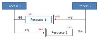 Process 1은 Resource 1을 먼저 요청하여 얻고, Process 2는 Resource 2를 먼저 요청하여 얻은 이후 Process 1은 Resource 2를 요청하지만 Process 2가 사용하여 얻을 수 없다. 마찬가지로 Process 2도 Resource 1을 요청하지만 Process 1이 요청하여 서로 무한정 wait이 된다.