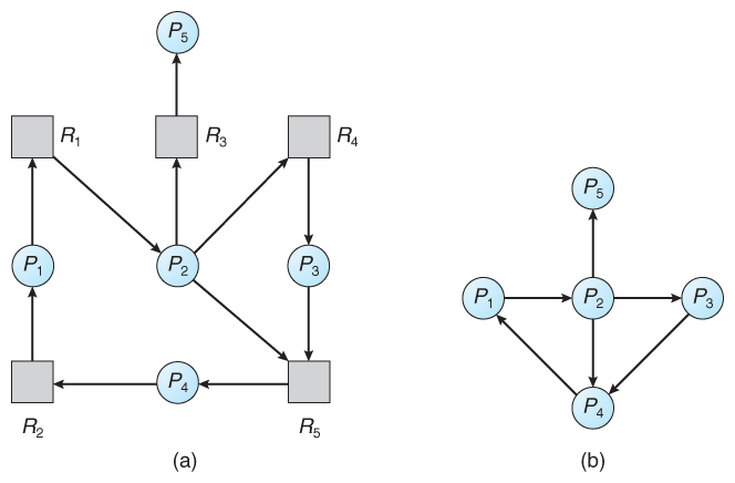(a) 자원 할당 그래프에 대응하는 (b) 대기 그래프다.