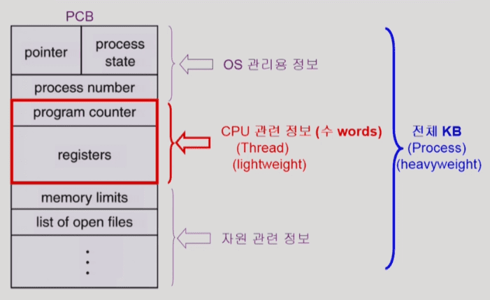 Thread끼리 Address space의 data, code 영역은 공유하되 stack은 별도로 할당 받는다. PCB에서는 program counter와 register set을 제외한 프로세스 관련 정보 및 자원을 모두 공유한다. 여기서 thread들이 공유하는 부분인 code section, data section, OS resources를 task라고 한다. 그래서 전통적인 개념의 heavyweight process는 하나의 쓰레드를 가지고 있는 task로 볼 수 있다.