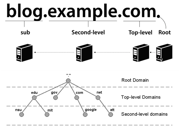통상적으로 도메인의 가장 끝에 있는 점(.)은 생략되어 있다. 이것을 Root 도메인이라고 부른다. Root 도메인의 직속 하위 도메인을 Top-level 도메인이라고 부르며 com, net, co.kr 등이 있다. Top-level 도메인 직속 하위 도메인은 Second-level 도메인이라고 부르며 그 직속 하위 도메인을 Sub 도메인이라고 부른다.