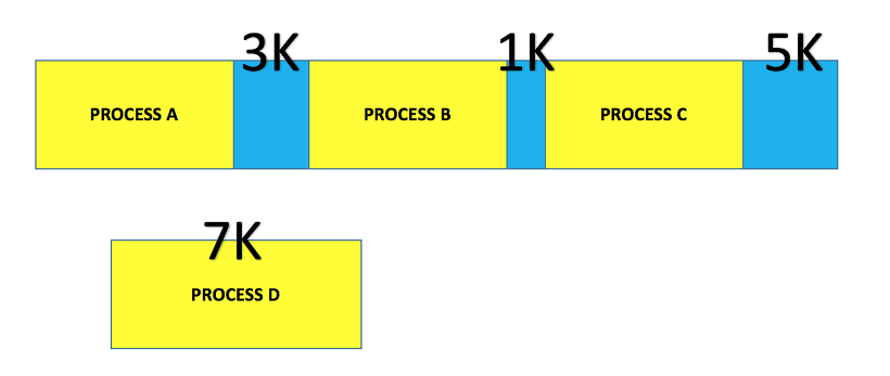 - 메모리 할당 및 해제 작업의 반복으로 작은 메모리가 중간 중간 존재할 수 있다. 이렇게 사용하지 않는 메모리가 존재해서 총 메모리 공간은 충분하지만 실제로 할당할 수 없는 상황이다.