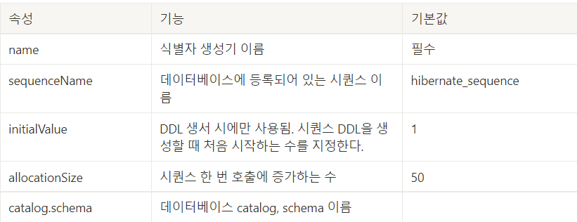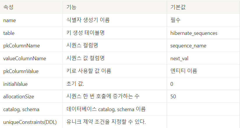 - TABLE: 데이터베이스 시퀀스 생성용 테이블에서 식별자 값을 획득한 후 영속성 컨텍스트에 저장한다.