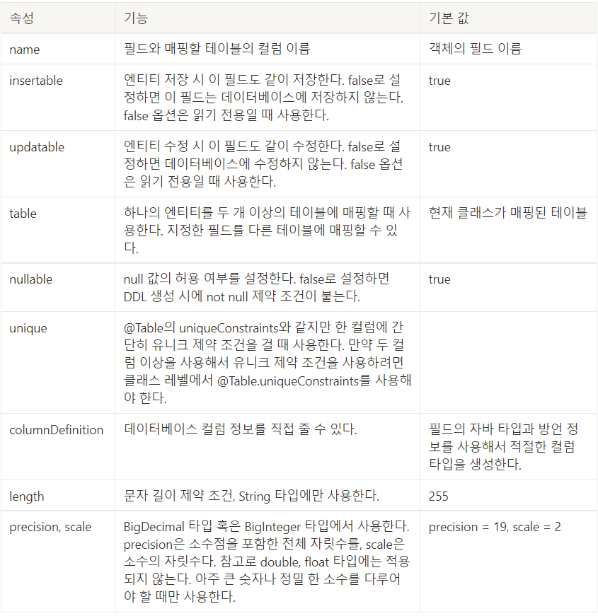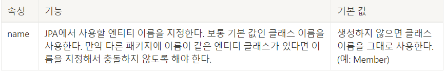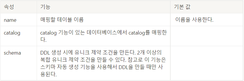 @Table은 엔티티와 매핑할 테이블을 지정한다. 생략하면 매핑한 엔티티 이름을 테이블 이름으로 사용한다.