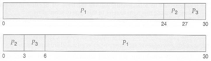 - 위 사진처럼 어떤 프로세스가 먼저 실행되느냐에 따라 전체 대기 시간에 상당한 영향을 미침