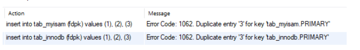 그런데 두 테이블의 레코드를 조회해 보면 MyISAM 테이블에는 오류가 발생했음에도 1과 2는 삽입된 것을 알 수 있다. Memory 스토리지 엔진을 사용해도 이와 동일한 결과가 나온다.