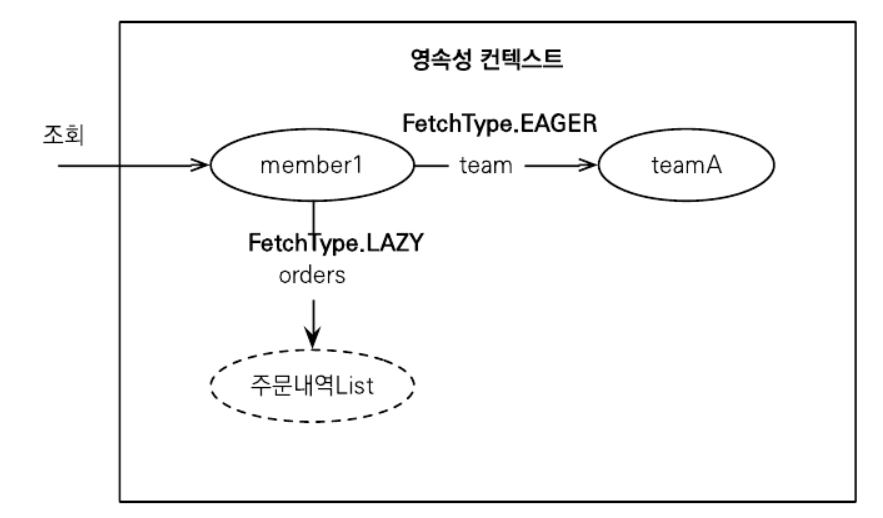 - 회원과 팀은 조인 쿼리를 통해 함께 조회되고, 회원과 주문 내역은 주문 내역에 대한 결과를 프록시 객체로 반환한다. 따라서 회원을 조회했을 때, 주문 내역은 SQL 쿼리에 나타나지 않는다.
