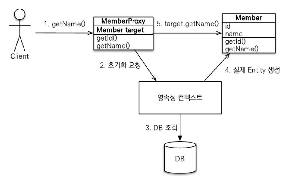 member.getName()을 호출해서 실제 데이터를 조회한다. - 프록시 객체는 실제 엔티티가 생성되어 있지 않으면 영속성 컨텍스트에 실제 엔티티 생성을 요청하는데 이것을 초기화라 한다.
