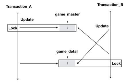 예를 들어, game_master , game_detail 테이블이 있다고 가정하자. 트랜잭션 A가 game_master 테이블의 5번 row를 수정하고, game_detail 테이블의 5번 row를 이어서 수정하려고 한다. 트랜잭션 B는 game_detail 테이블의 5번 row를 수정하고 game_master 테이블의 5번 row를 수정하려고 한다.