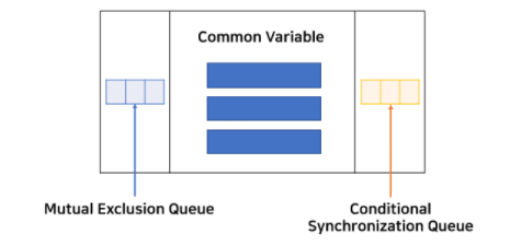 공유 자원을 점유 중인 프로세스(스레드)는 Lock을 가지고 있다. 공유 자원을 점유 중인 프로세스(스레드)가 있는 상황에서 다른 프로세스(스레드)가 공유 자원에 접슨하려고 하면 외부 모니터 조건 동기 큐(준비 큐)에서 진입을 기다린다.