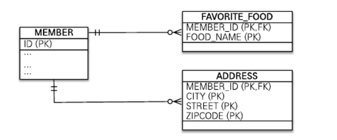 favoriteFoods는 기본 값 타입인 String을 컬렉션으로 가진다. 이것을 데이터베이스 테이블로 매핑해야 하는데, 관계형 데이터베이스의 테이블은 컬럼 안에 컬렉션을 포함할 수 없다. 따라서 아래처럼 별도의 테이블을 추가해야 한다. addressHistory도 마찬가지로 별도의 테이블이 필요하다.