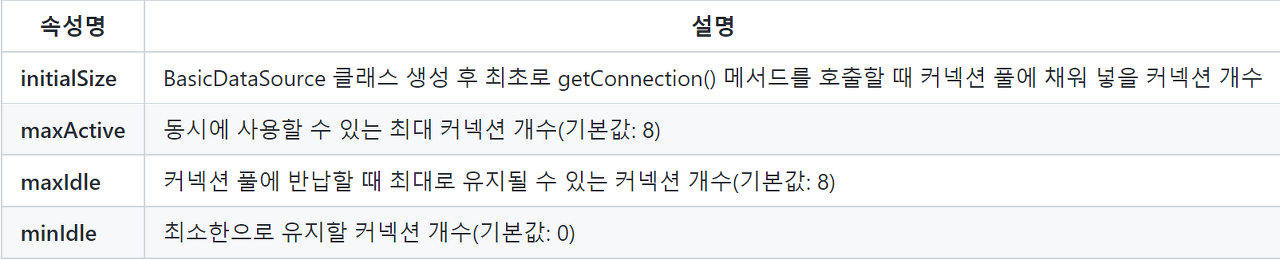 - 이후 비즈니스 로직이 커넥션을 사용한 후 pool에 반납할 경우, maxIdle = 5에 영향을 받아 커넥션을 실제로 닫아버리므로 일부 커넥션을 매번 생성했다 닫는 비용이 발생할 수 있다.