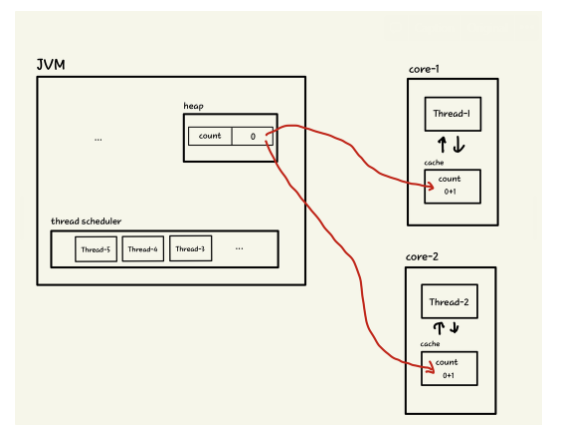위 그림은 JVM 내의 스레드 스케줄러에 의해 각각의 core에 스레드-1과 스레드-2가 선점된 상태이고, 두 스레드는 각각 for문에서 공유 변수 count를 증가시킨다고 가정한다.