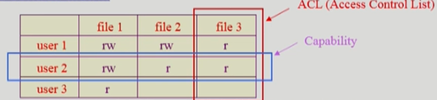 - Access Control List: 파일 별로 누구에게 어떤 접근 권한이 있는지 표시