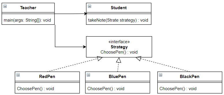 펜을 고르는 전략을 Strategy, 전략을 수행하는 Student, 구체 클래스를 주입하는 Teacher로 구성되어 있다.