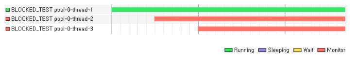 thread-2와 thread-3이 BLOCKED 상태에 빠진 것을 알 수 있다.