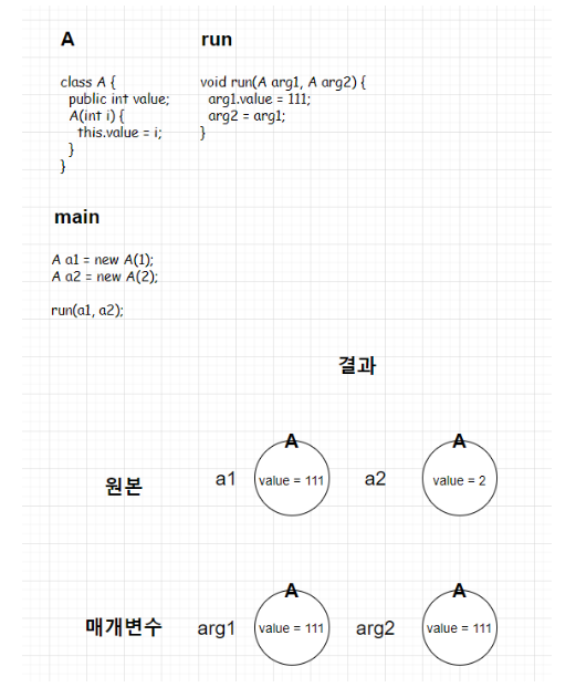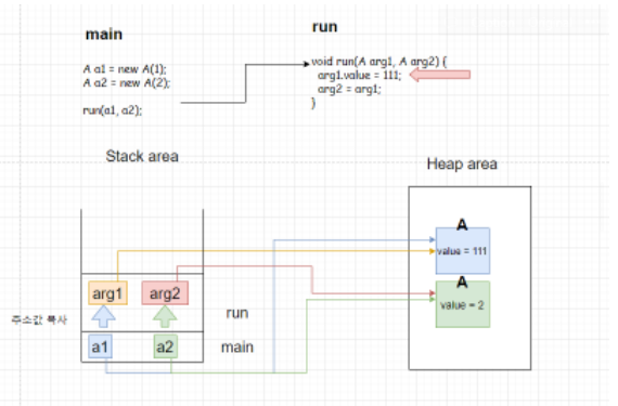 - 메소드를 호출할 때 넘겨 주고 싶은 인자를 지정하면, 메소드의 매개 변수가 지정한 변수의 레퍼런스로 초기화되는 것이다.