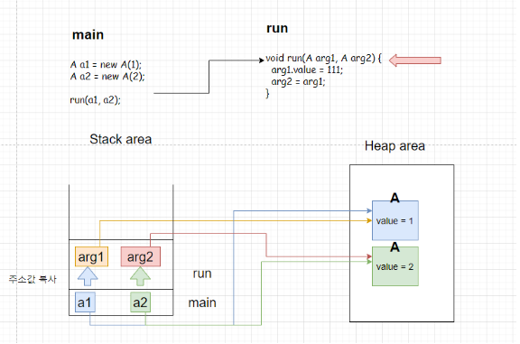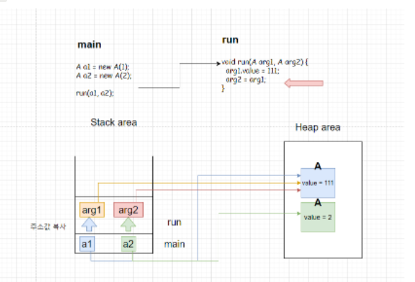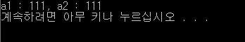 a1과 a2가 각각 arg1, arg2로 참조를 넘기므로 a1과 a2의 값이 모두 111로 변경되는 것을 확인할 수 있다.