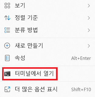 이후 EC2 인스턴스에 접속할 pem 키가 존재하는 디렉토리 경로로 이동한 다음, [터미널에서 열기]를 눌러 줍니다. 그리고 아래 명령어를 실행하면 SSH 접속이 완료됩니다.