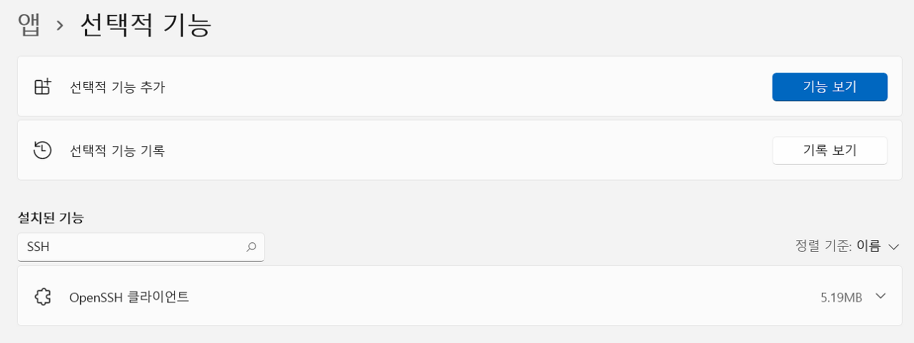 설치된 기능에 OpenSSH 클라이언트가 이미 존재한다면 넘어가도 되고, 그렇지 않으면 [기능 보기] 버튼을 클릭하여 OpenSSH 클라이언트를 설치합니다.