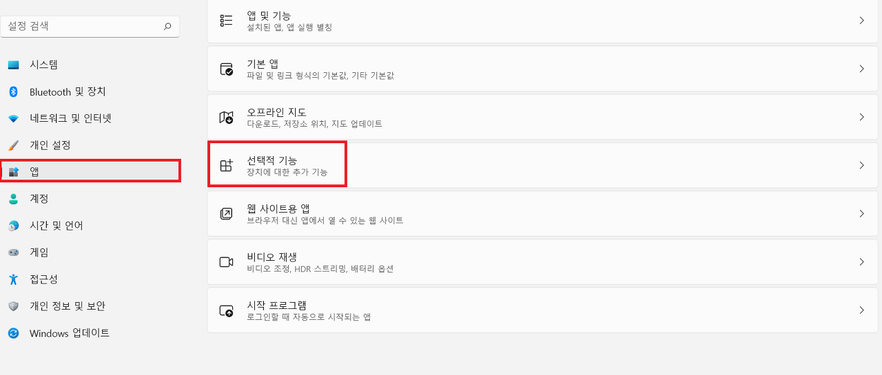윈도우 설정에서 앱 설정의 선택적 기능에 들어갑니다.