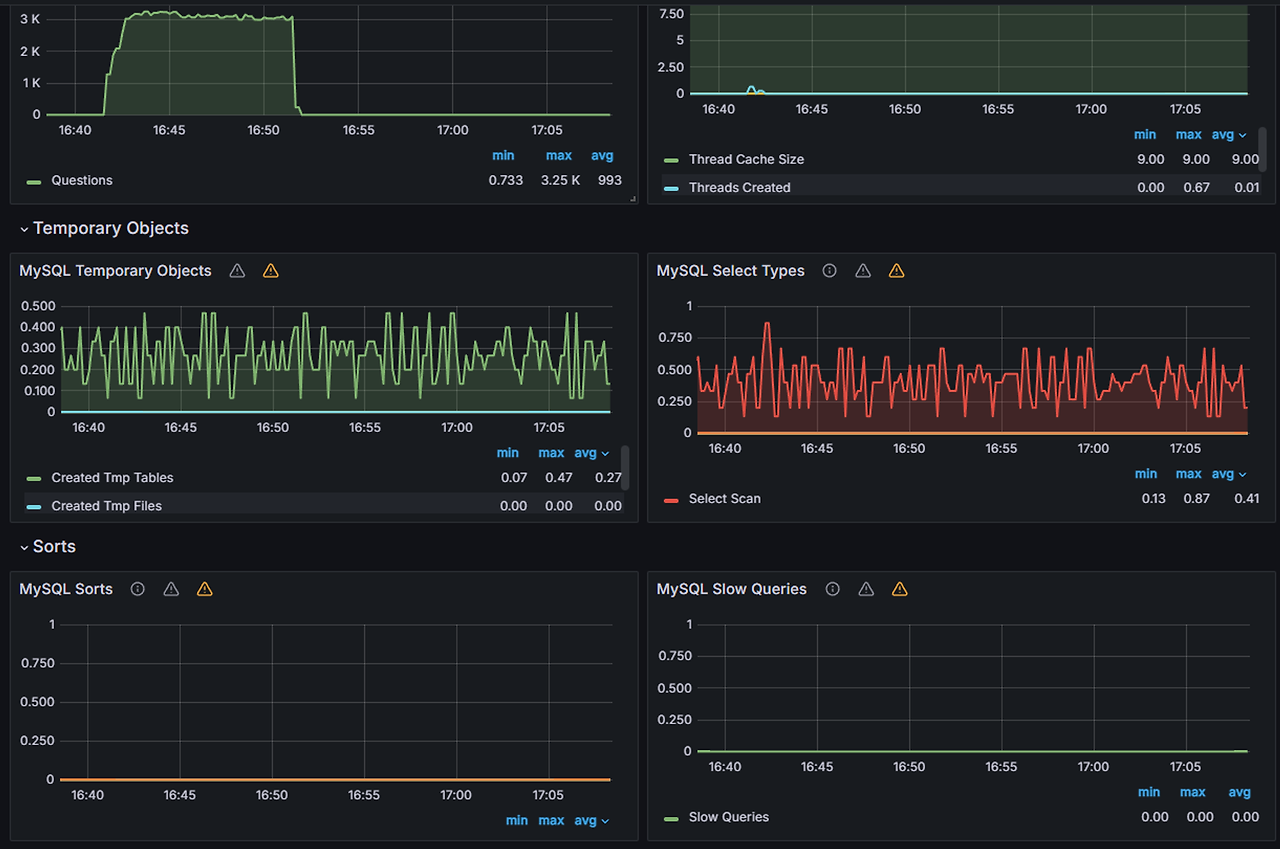 특히 슬로우 쿼리를 개선할 때 도움이 많이 됩니다. 다만, mysqld-exporter의 경우 서버 cpu 사용량 정보는 주지 않고 전반적인 mysql의 각종 지표를 주는 것이라 cpu 사용량을 체크하고 싶다면 docker stats 명령어를 사용하시길 바랍니다.