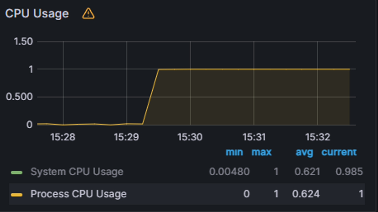 또한, 그라파나에서도 마찬가지로 CPU 사용량을 확인할 수 있습니다. 이때 Spring을 실행 중인 프로세스인 Process CPU Usage를 봐야 합니다.