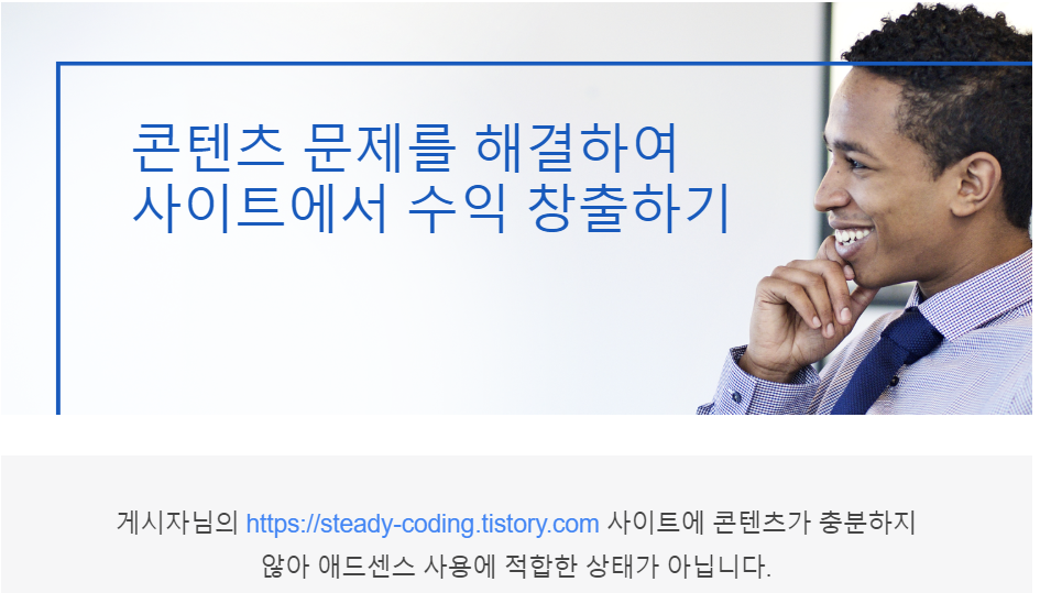 이런... 가장 많이 막히는 이유로 제 블로그도 애드센스 승인에 실패해버렸죠.