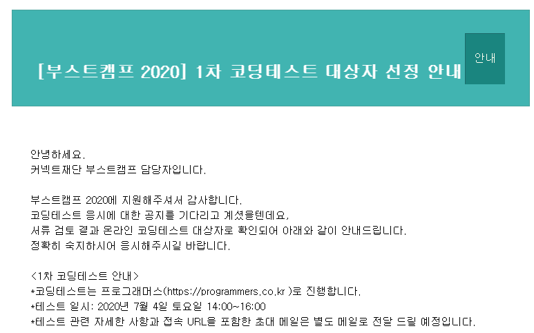 요약하자면, 제가 서류에 합격하였으니 이번주 토요일에 코딩 테스트에 시험을 치라는 것이었죠.