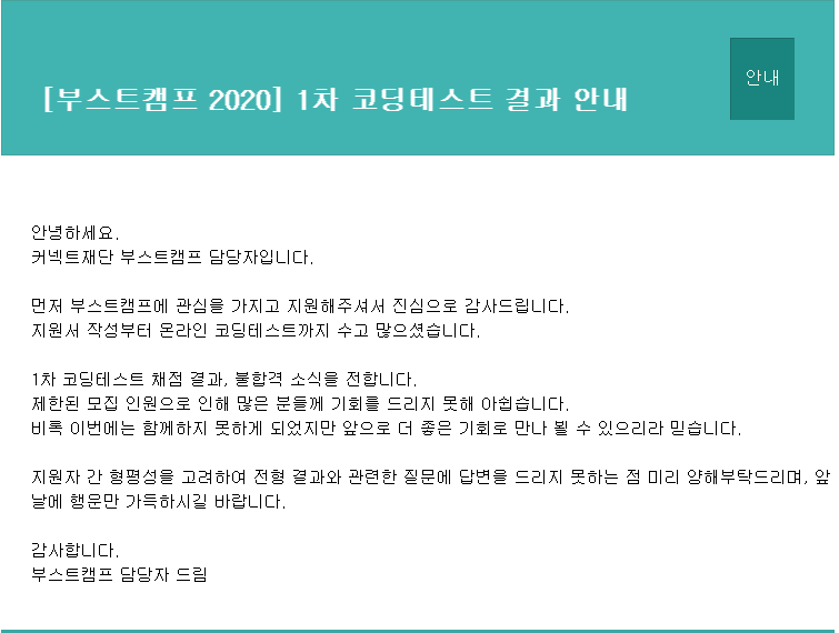 그리고 병원 안에서 어제 하나의 메일이 왔고, 제목이 저번에 시험 본 1차 코딩테스트에 대한 결과 발표였습니다.
