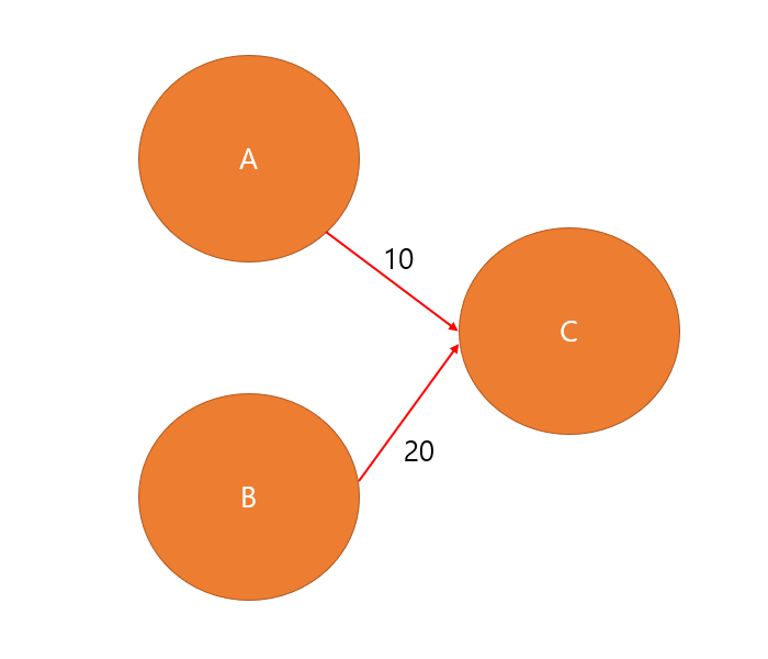 A -> C는 10초, B -> C는 20초라고 하였을 때 간선은 아래와 같은 그림일 것입니다.