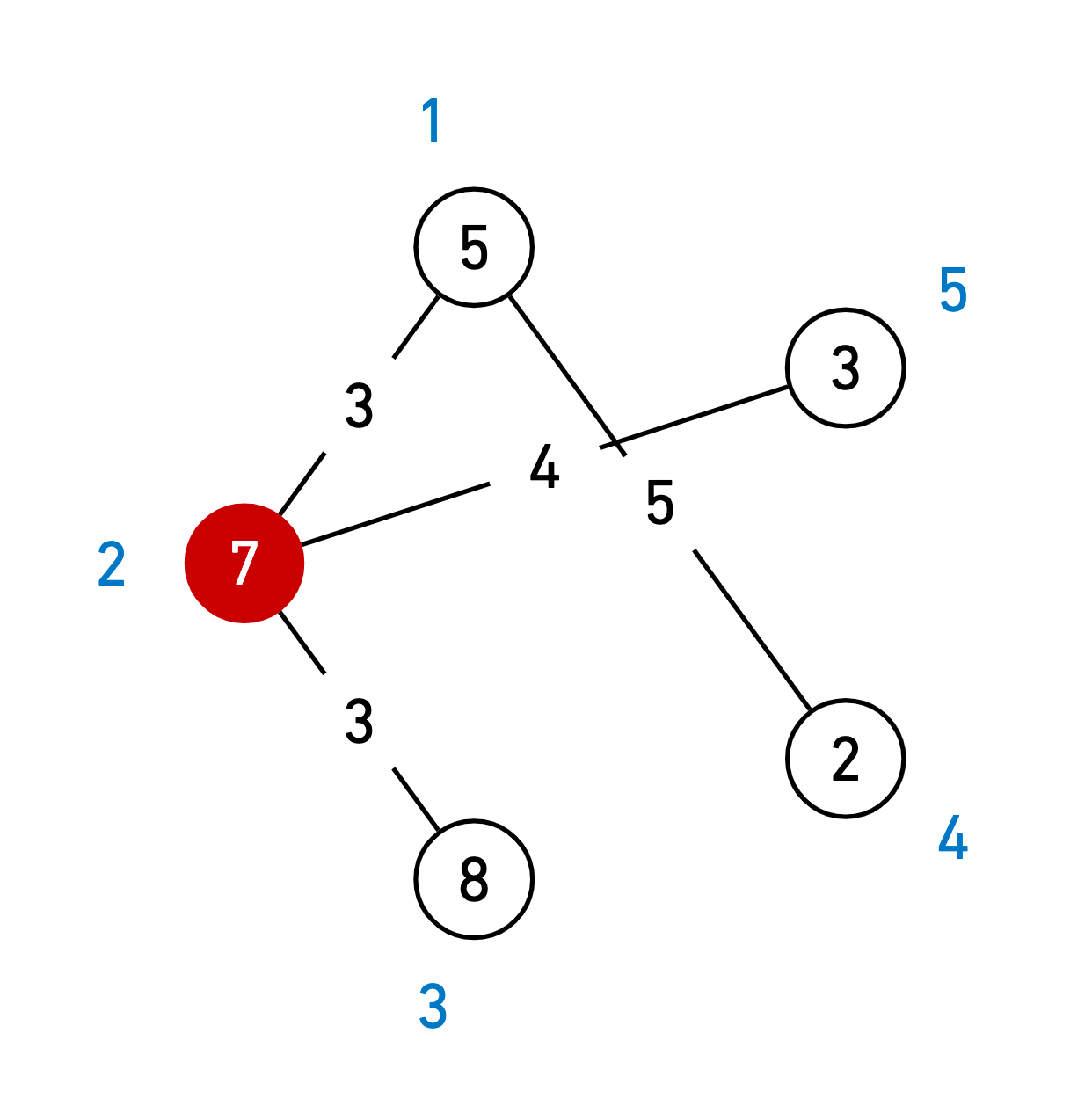예은이가 2번 지역에 떨어지게 되면 1번,2번(자기 지역), 3번, 5번 지역에 도달할 수 있다. (4번 지역의 경우 가는 거리가 3 + 5 = 8 > 4(수색범위) 이므로 4번 지역의 아이템을 얻을 수 없다.) 이렇게 되면 예은이는 23개의 아이템을 얻을 수 있고, 이는 위의 필드에서 예은이가 얻을 수 있는 아이템의 최대 개수이다.
