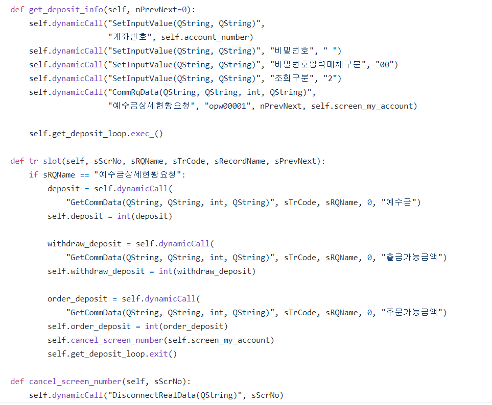 전에 로그인을 하는 과정에서 이벤트 루프를 수행하였는데, 트랜잭션을 요청할 때도 반드시 이벤트 루프를 걸어줘야합니다. 그리고 예수금 관련 변수와 화면 번호 변수가 추가되었습니다. 마지막으로, 초기 작업에 예수금 관련된 정보를 얻어오는 함수가 생겼네요.